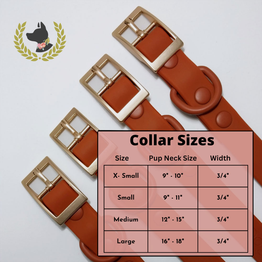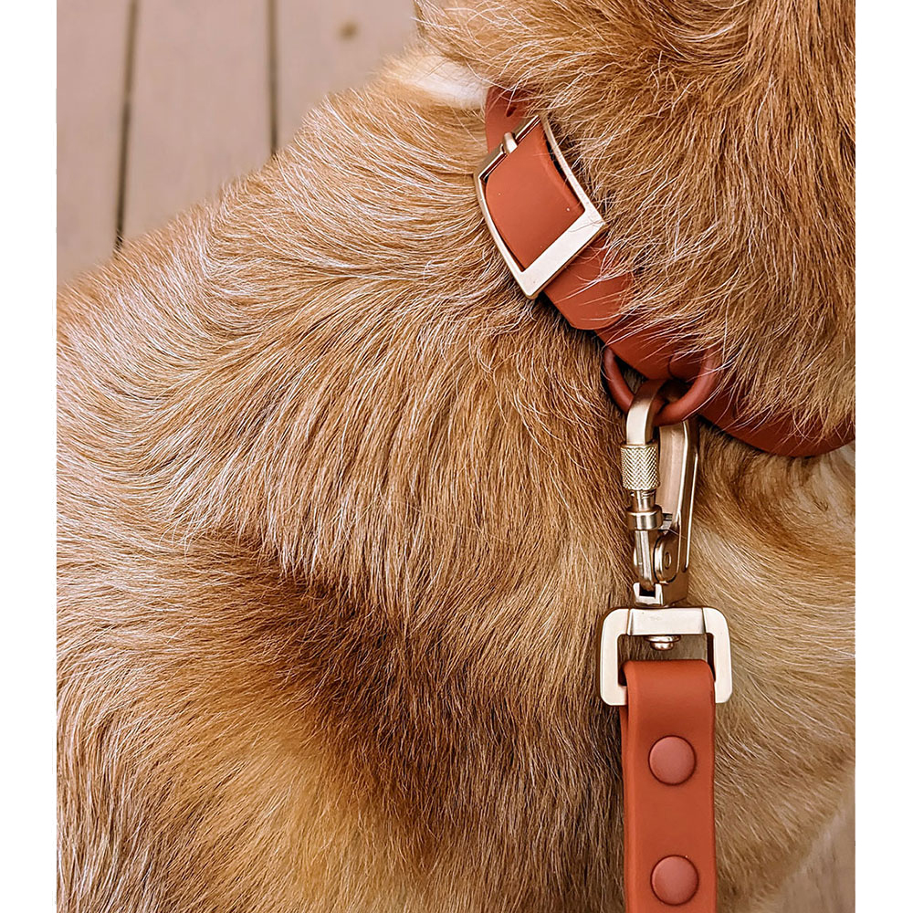 Our Terracotta color with soft brushed gold hardware is classic and complements any stunning wedding colors! Wear on its own or easily add any bandana, floral collar or attachment fur a bit of flair!